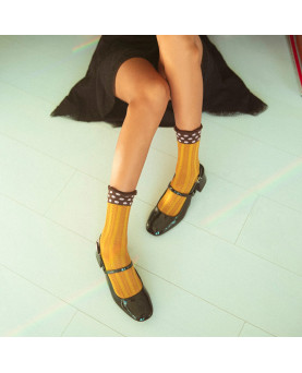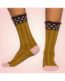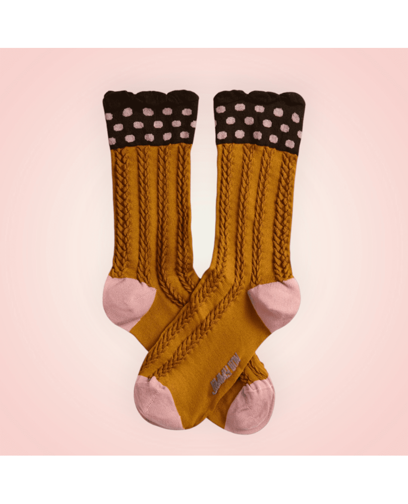 Si estás cansada de complementos lisos y aburridos, ¡tenemos los calcetines que crearán una experiencia sensorial única en tus pies! Con una combinación de texturas y detalles atrevida y muy llamativa, este diseño te enamorará por el trenzado estilo espiga en relieve que recorrerá tus piernas de arriba a abajo. Además, el fondo del calcetín en amarillo mostaza y el elástico de la parte superior lleno de lunares en tono rosa palo provocarán una irresistible explosión de estilo y color allá donde pises.