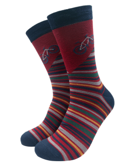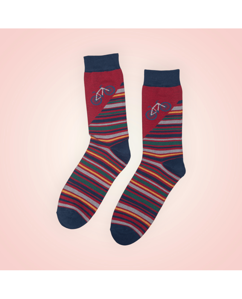 Calcetines de bambú con bicicleta de montaña y con estampado de rayas. Un calcetín de vestir clásico de rayas azul marino y burdeos con una bicicleta de montaña