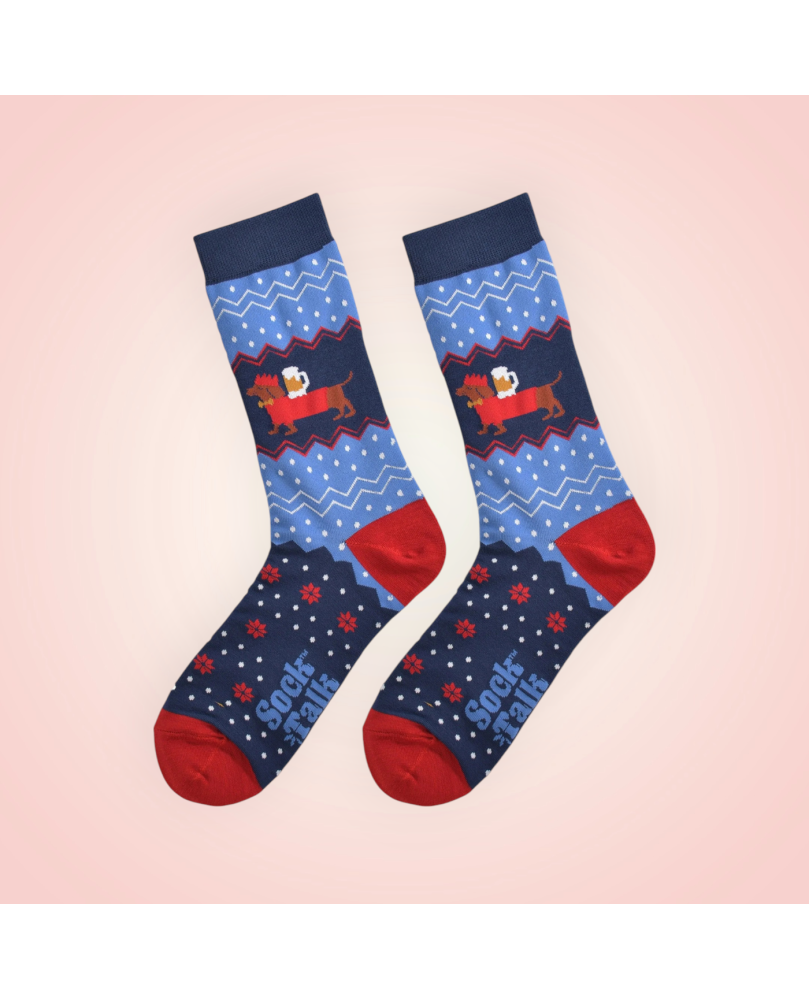 Estos calcetines navideños para perros, diseñados en el Reino Unido, están confeccionados con bambú naturalmente transpirable. Presentan perros salchicha que llevan pintas de cerveza y un patrón inspirado en Fair Isle. Estos calcetines navideños son ecológicos y súper suaves.