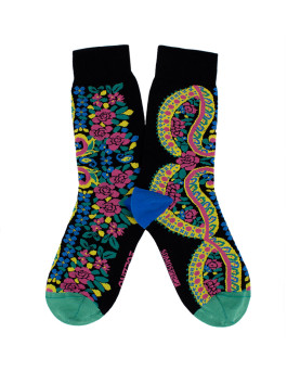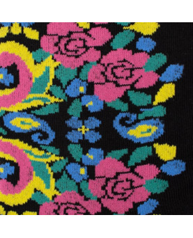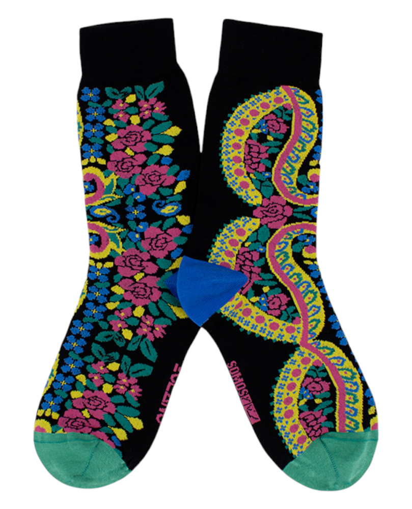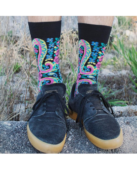 Este colorido modelo está basado en los típicos diseños de los pañuelos tradicionales: flores, cachemiras y hojas para decorar estos preciosos calcetines.