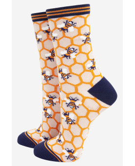 Calcetines de bambú para mujer con temática natural. Presentan un panal y abejas, con detalle de rayas en el puño. Calcetines de bambú con estampado de panal y abejas para mujer Antibacteriano Antifúngico Suave y transpirable Ecológico