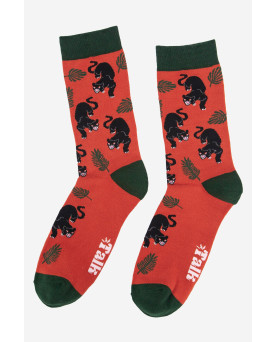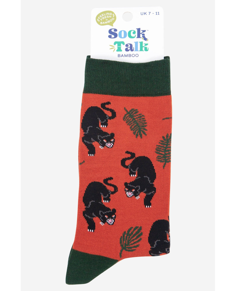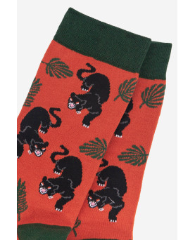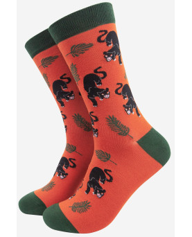 Calcetines de bambú con temática de jungla para hombre que presentan una pantera negra merodeando y un motivo de hojas de jungla en todas partes. Calcetines de bambú con estampado de pantera merodeadora y hojas de la jungla para hombre