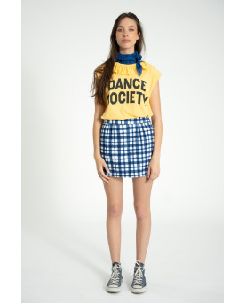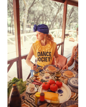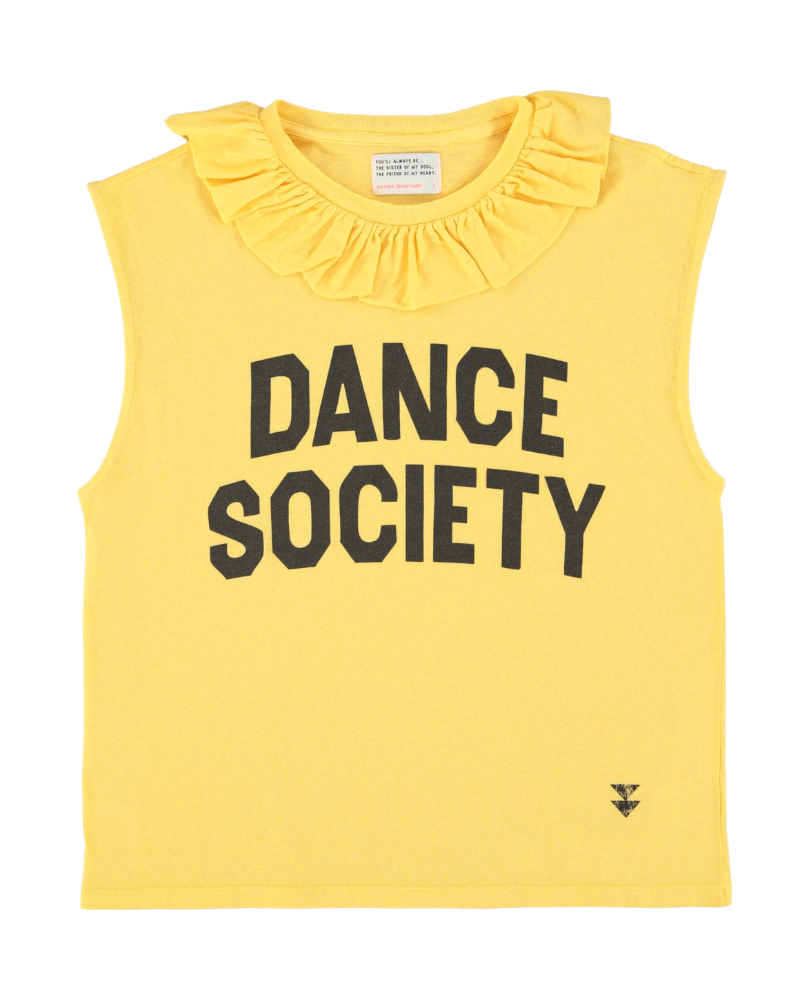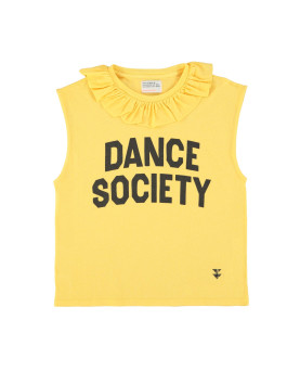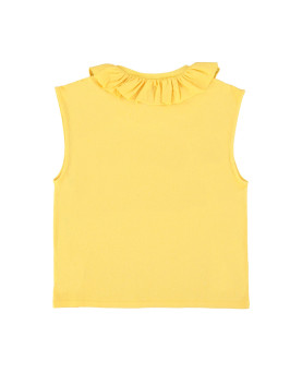 Camiseta sin mangas con cuello con volantes en color amarillo. Detalle de estampado frontal. Pequeño logotipo estampado en la parte delantera. Tejido en lino y algodón