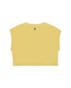 Camiseta sin mangas con cuello redondo y bajos de gofre. Detalle de estampado frontal. Pequeño logo estampado en el cuello. Corte oversize