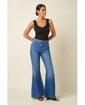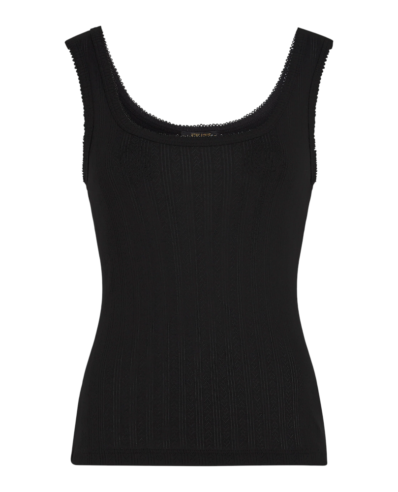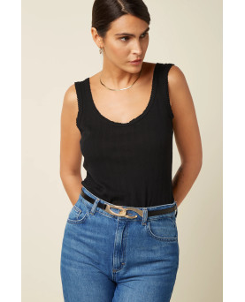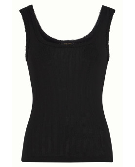 Delicada camiseta en canalé de color negro con tirante ancho con detalle de puntilla muy fina en el escote y mangas. Un básico que no debe faltar en tu armario.