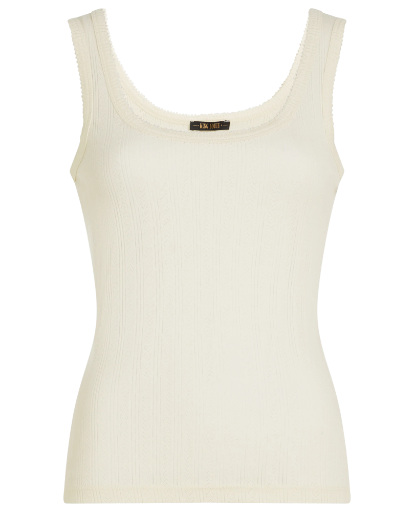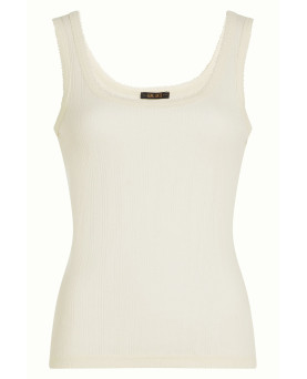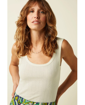 Delicada camiseta en canalé de color crema con tirante ancho con detalle de puntilla muy fina en el escote y mangas. Un básico que no debe faltar en tu armario.