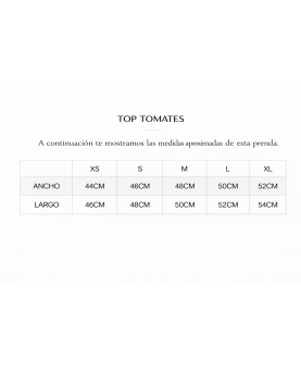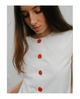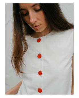 Diseñado con escote cerrado y manga sisa, destaca por su cierre frontal con botones decorativos en forma de tomate, que aportan un toque divertido.