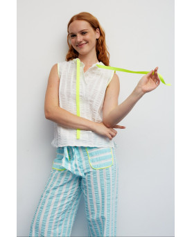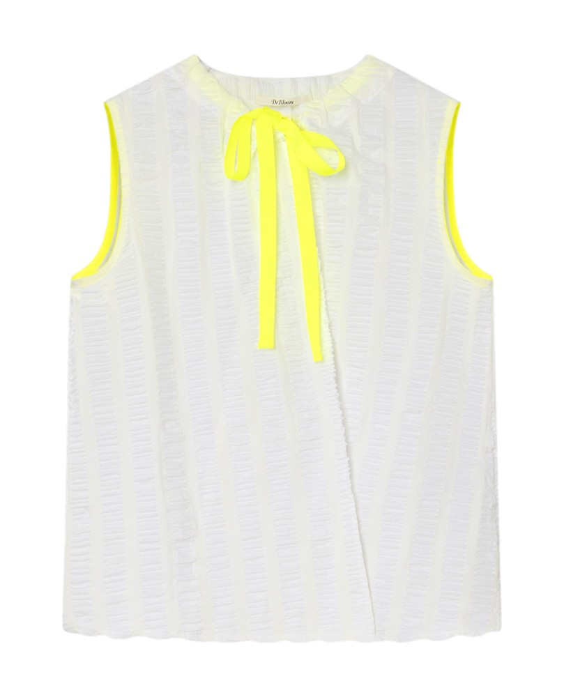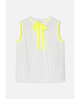 ¡Un toque distinto que se nota desde el primer momento! Un cuerpo pensado para aportar luz y delicadeza a los looks de verano. Su diseño en blanco destaca por un tejido con relieve sutil que añade textura y movimiento, creando un efecto ligero y muy elegante. El lazo en amarillo neón en el escote aporta un contraste único y divertido que hace la prenda especial. Con una silueta recta y fluida, es cómodo y fácil de llevar durante todo el día.