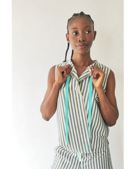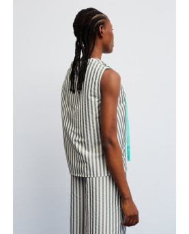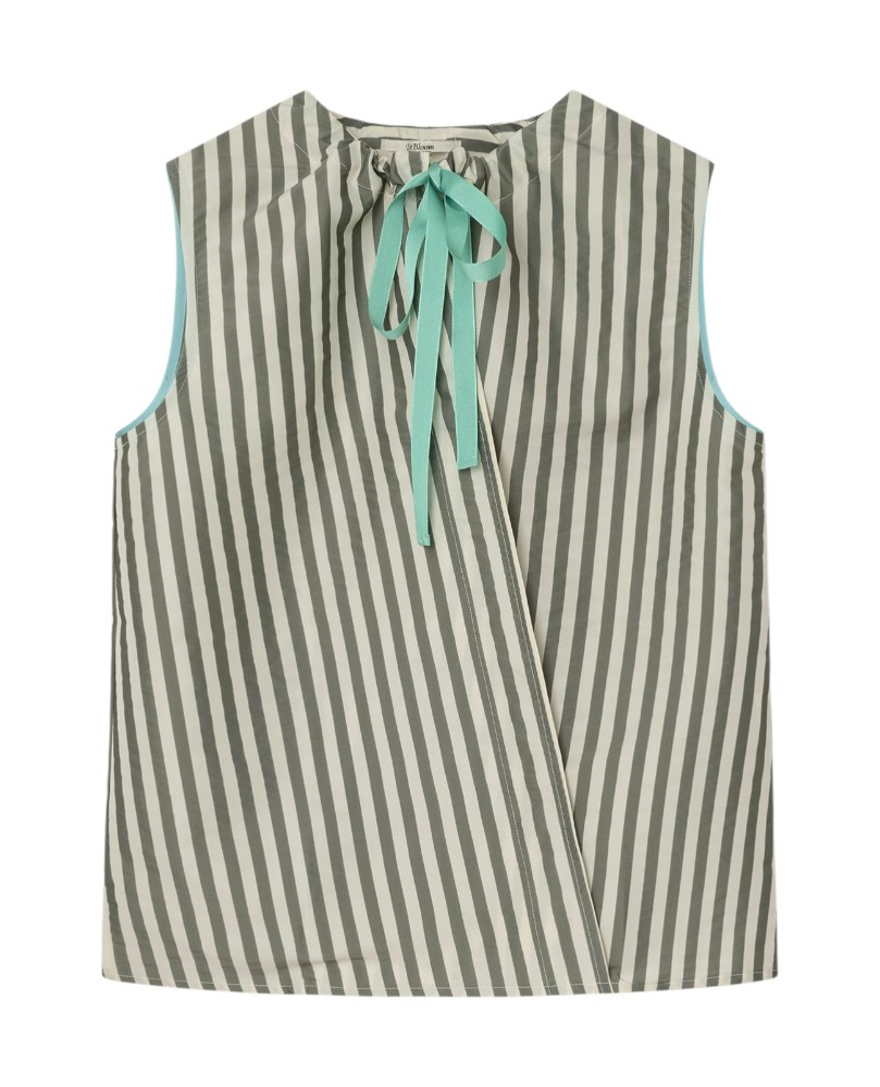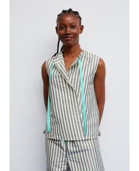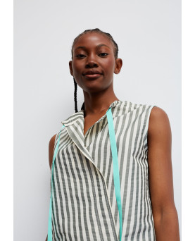 ¡Un toque distinto que se nota desde el primer momento! Cuerpo de rayas en tejido técnico pensado para aportar luz y delicadeza a los looks de verano. Su diseño en rayas caqui y blanco destaca por un tejido con relieve sutil que añade textura y movimiento, creando un efecto ligero y muy elegante. El lazo en turquesa en el escote aporta un contraste único y divertido que hace la prenda especial. Con una silueta recta y fluida, es cómodo y fácil de llevar durante todo el día.