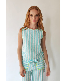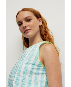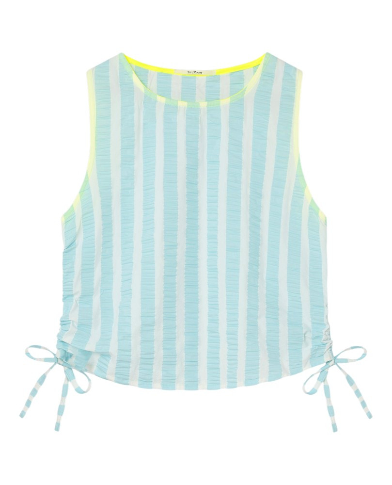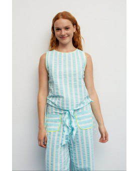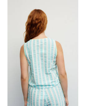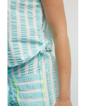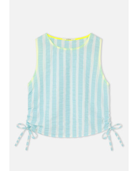 ¡Añade frescura y estilo al instante! Un cuerpo pensado para aportar luz y frescura a los looks de verano. Su diseño combina rayas verticales en agua y blanco sobre un tejido con relieve sutil que añade textura y movimiento. Los lazos laterales ajustables permiten fruncir la silueta, ofreciendo un detalle personalizado y único. Con cuello redondo y un corte recto, es una prenda ligera y cómoda, perfecta para los días cálidos. Ideal para combinar con un básico o a conjunto.