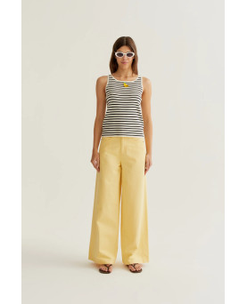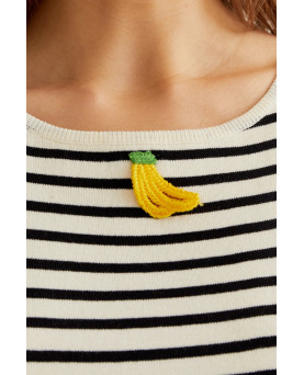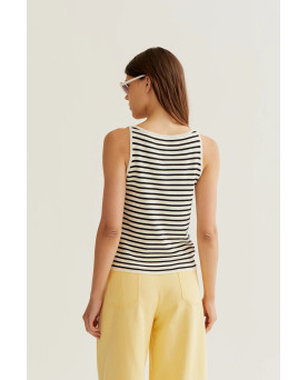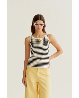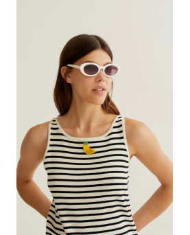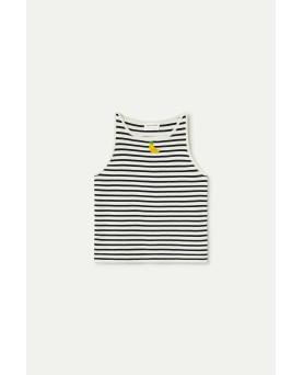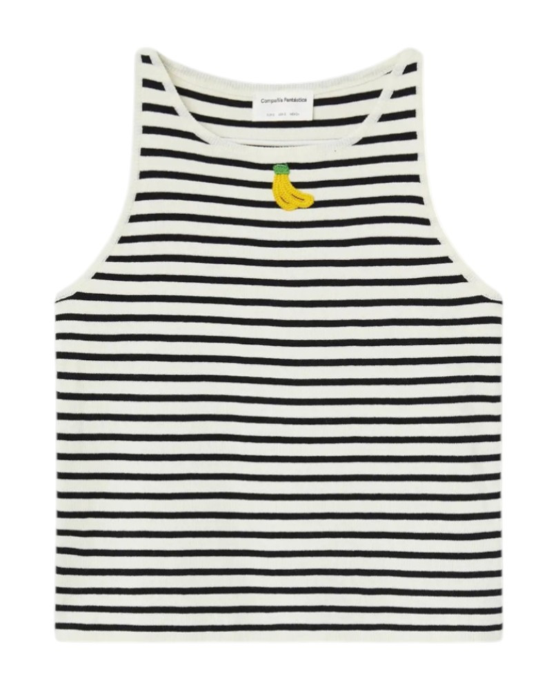 Top con tejido punto de raya estampada de color blanco y negro. Cuello redondo y sin mangas. Detalle de banana bordada. Acabados en rib. La modelo mide 177 cm y lleva la talla S.