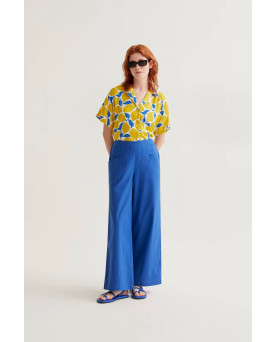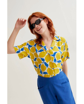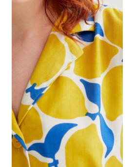 Camisa con estampado limoncello. Cuello con solapa y manga 3/4. Hombro caído. Cierre frontal con botones. La modelo mide 175 cm y lleva la talla S.