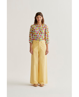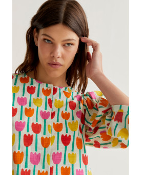 Camisa con estampado de tulipanes multicolor sobre fondo blanco roto, textura semejante al lino. Manga al codo abullonada. Corte recto . Largo a la cintura. La modelo lleva talla S