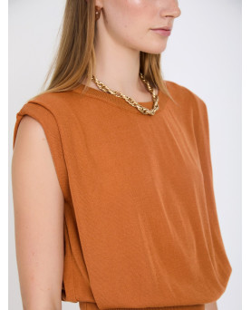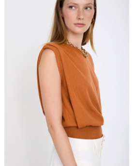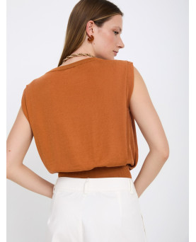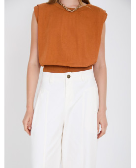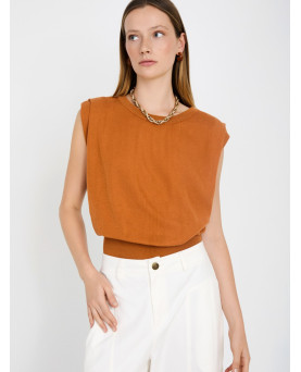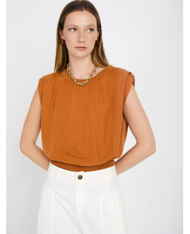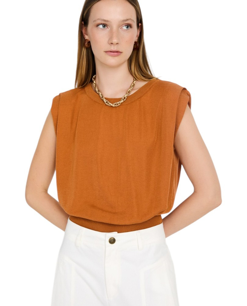 Top de punto sin mangas con tejido 100% tencel con acabado suave. Cuello redondo acanalado. Detalle del pliegue en el hombre. Bajo ancho de canalé.