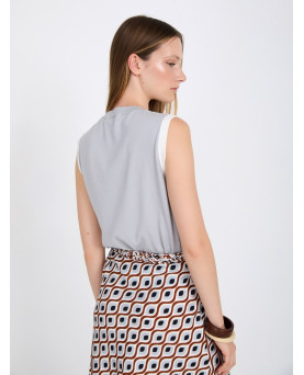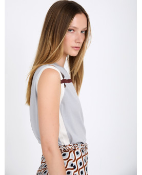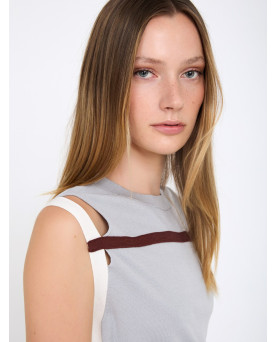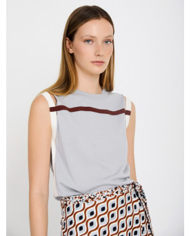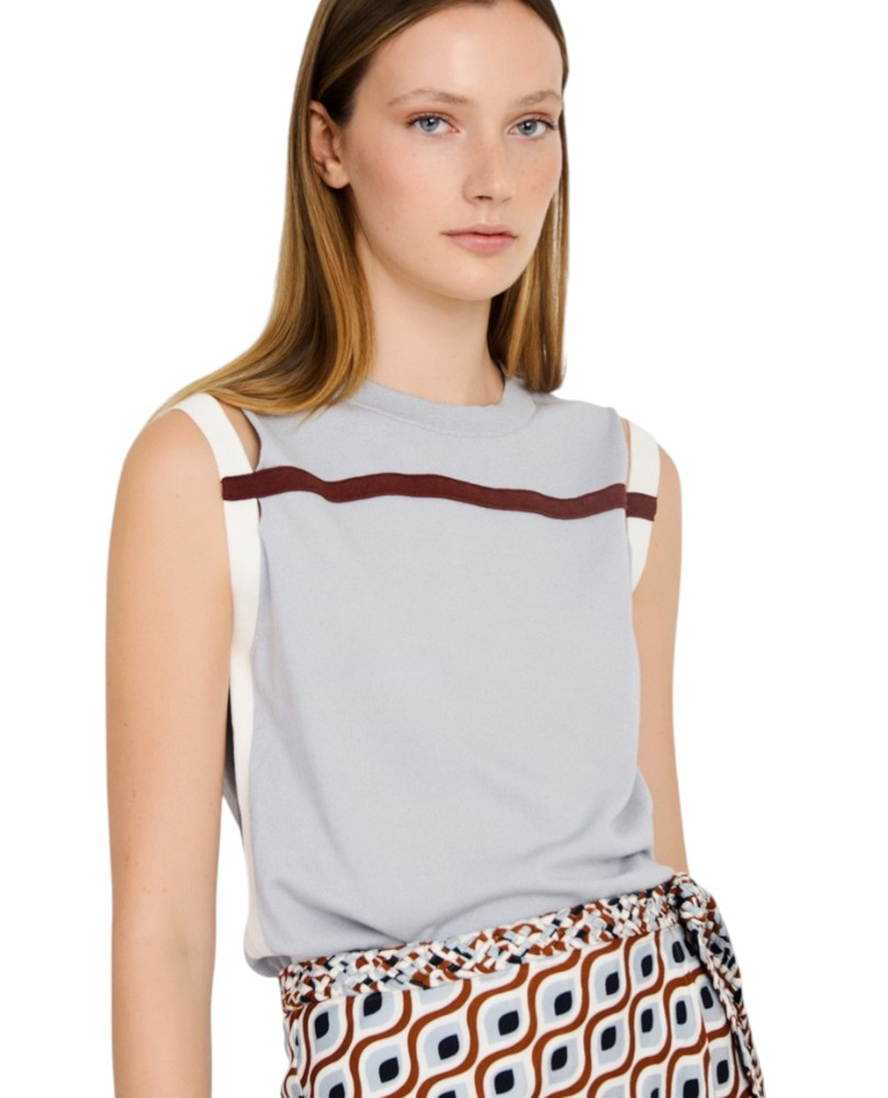 Top de punto sin mangas con hilo mezcla de viscosa. Escote redondo. Detalle de tiras de punto a contraste en hombros y pecho. Acabados de canalé en cuello y bajo. Fitting ligeramente ajustado.