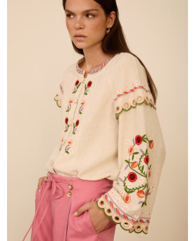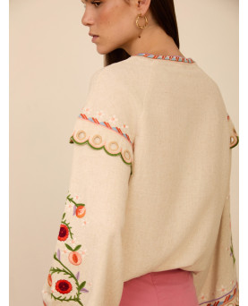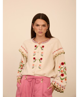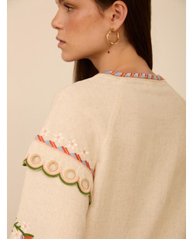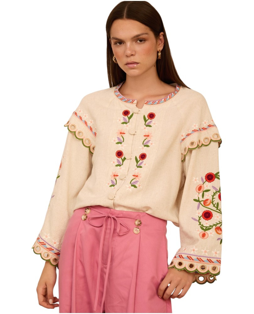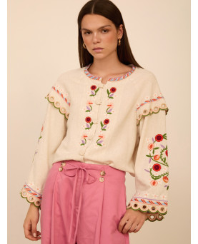 Camisa abierta en tejido de lino-algodón con bordados florales a contraste. Cuello redondo con botones forrados.