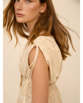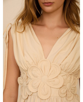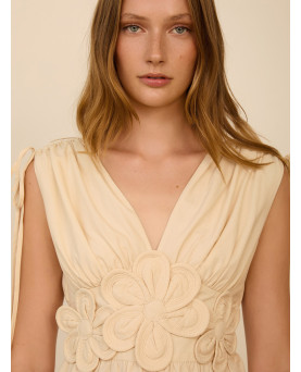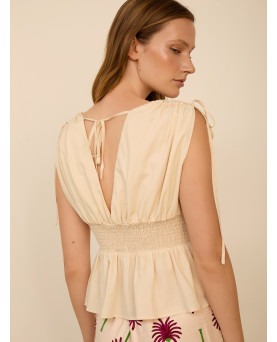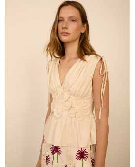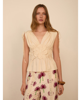 Top de algodón-viscosa con flores en relieve. Escote pico. Smock elástico en la espalda.