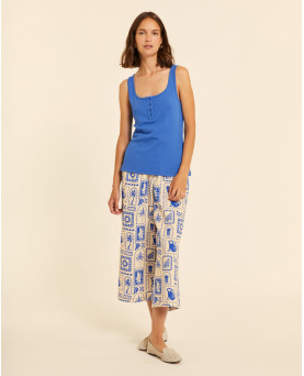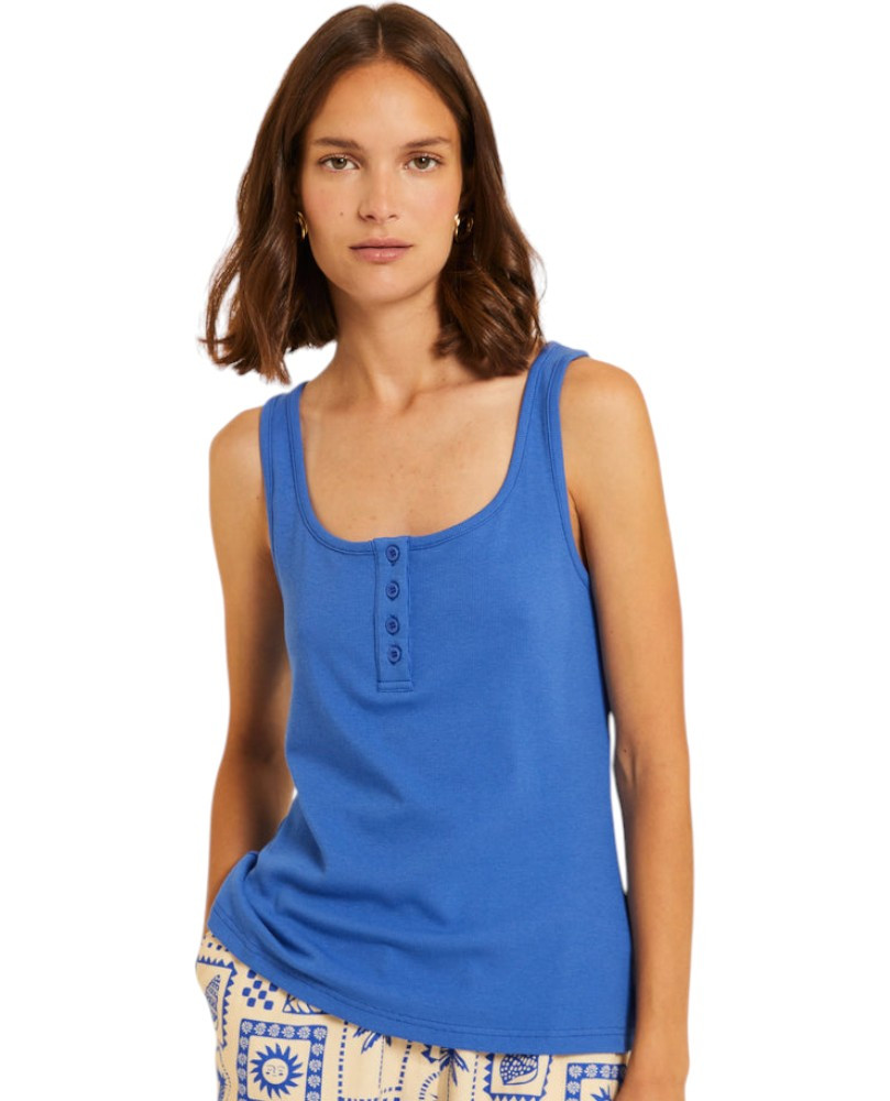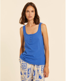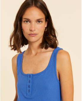 Top en color azul en tejido de canalé. Tirante lo suficientemente ancho para poder llevar sujetador sin que se vean los tirantes. Escote redondo bajo en pecho y cerrado en la espalda. Detalles de botones en el frente.