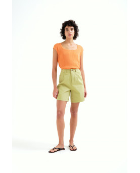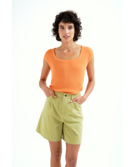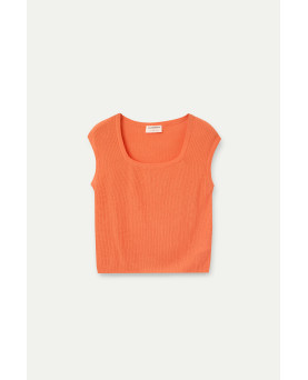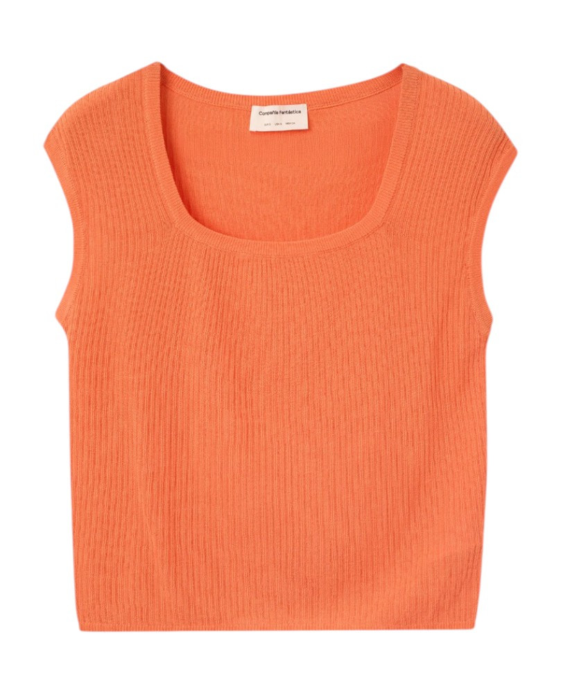 Top con tejido de punto fino de color naranja. Escote cuadrado y manga corta. Detalles acabados en rib. La modelo mide 175 cm y lleva la talla S.