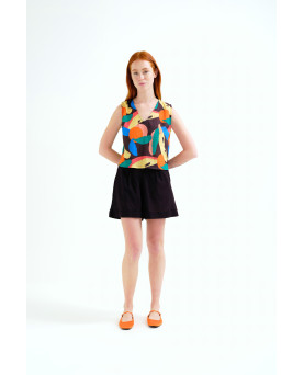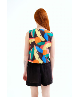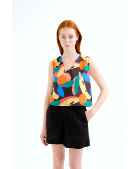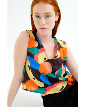 Top en color negro con estampado de frutas multicolor en colores brillantes. Sin mangas con escote a pico. Aberturas en los laterales. Corte recto amplio. La modelo mide 177 cm y lleva la talla S.