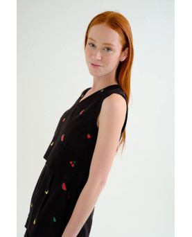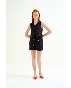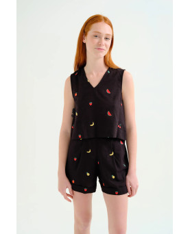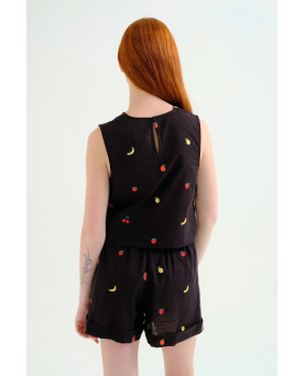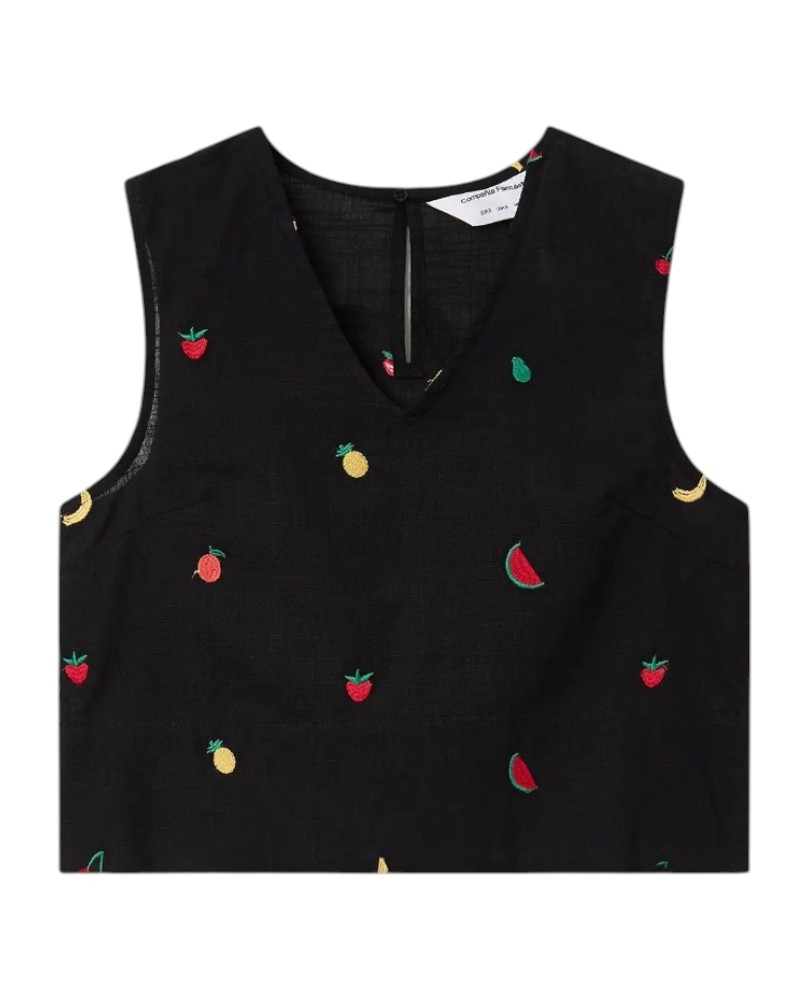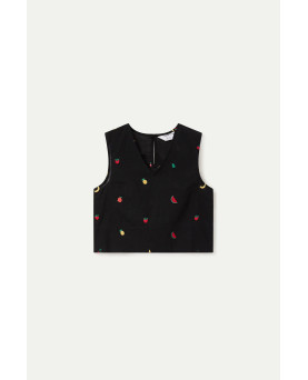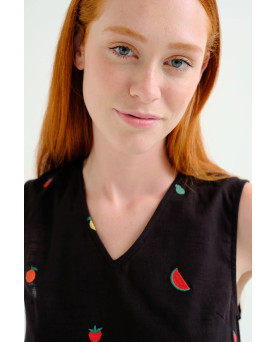 Top de tejido 100% algodón de color negro con bordado de ensalada de frutas. Escote pico y sin mangas. Cierre posterior con botón oculto. La modelo mide 175 cm y lleva la talla S.