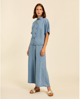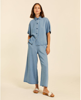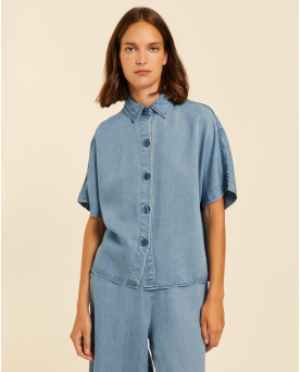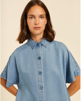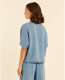 Camisa denim en tejido de tencel con mucha caída muy fresco para el verano. Manga kimono. Largo por la cintura. Corte recto