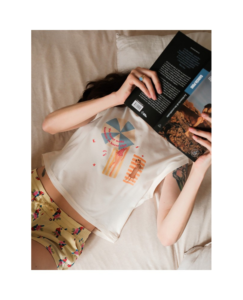Camiseta de tirantes CROP con impresión de tintas naturales. 100% algodón orgánico. Algodón peinado Ringspun. Corte relajado. Costuras laterales. Lavado con enzimas. Canalé 1 x 1 en el cuello y las sisas. Tira cubrecosturas del material principal en la parte interior del cuello. Acabado flatlock en el bajo de la prenda y las sisas. Prenda teñida tras el montaje: los colores podrían variar ligeramente. Esta prenda puede desteñir al entrar en contacto con tejidos claros. Su tallaje es normal, recomendamos talla habitual.