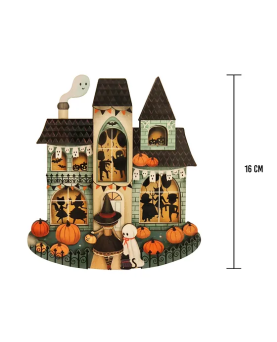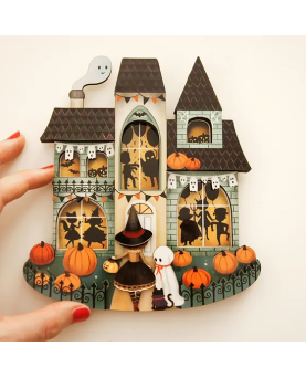 Escalofriantes disfraces, baile y mucha diversión te están esperando en la mejor fiesta de Halloween! ¡No te la puedes perder! Objeto de decoración de 16 x 14 cm. Realizado en madera ilustrada con acabado brillante y metacrilato. La luna brilla en la oscuridad. El reverso de la pieza lleva un gancho dorado para su fácil colocación en la pared. Ilustración y diseño originales de LaliBlue. Elaborado por completo en España.