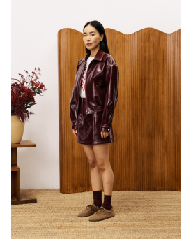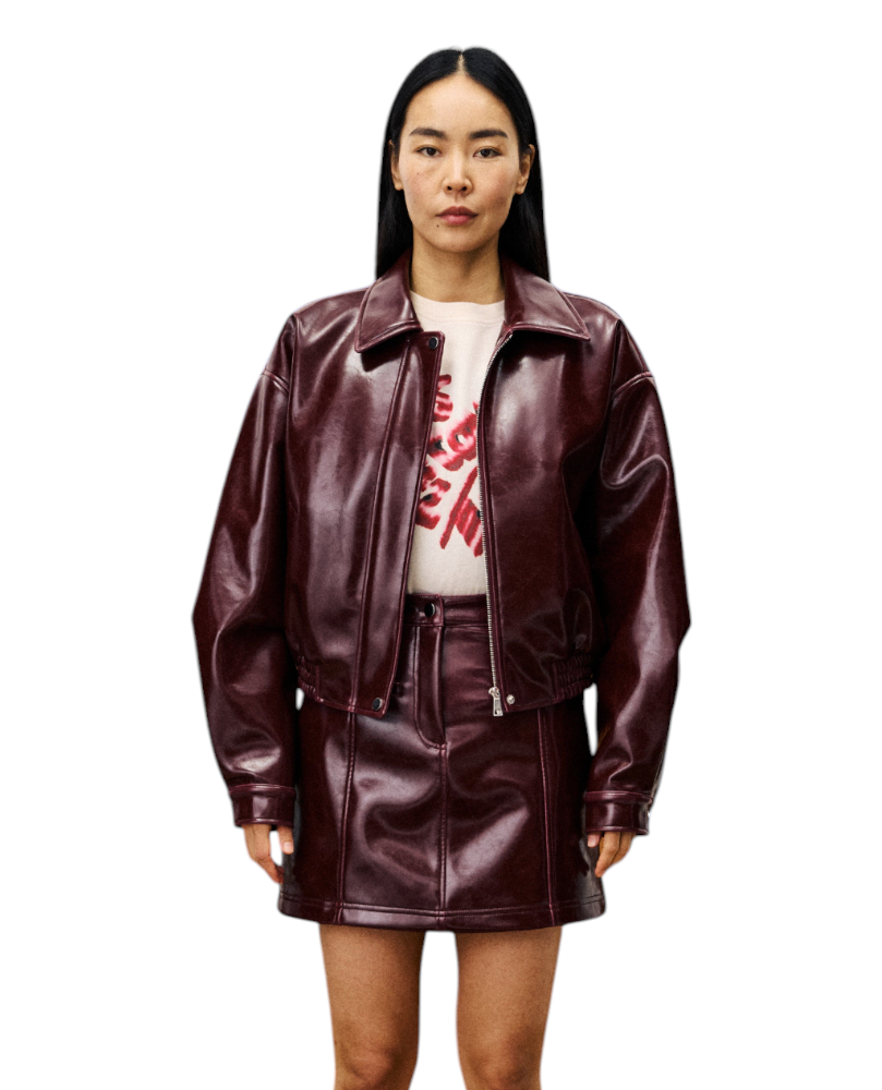 Falda de piel sintética de vinilo. Textura brillante. Bolsillos delanteros. Cremallera oculta en la parte delantera. Botón de presión. Trabillas para cinturón. Material duradero y ecológico. Forma de A
