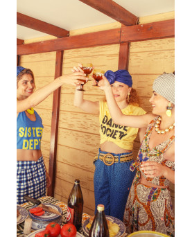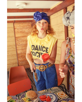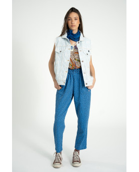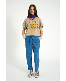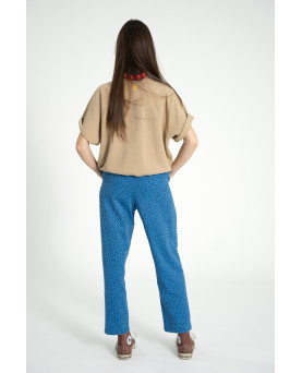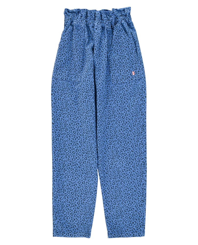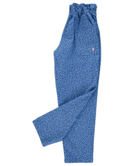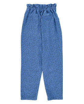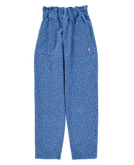 Pantalón con cintura elástica con volantes. Trabillas para cinturón. Bolsillos de parche delanteros y falsos bolsillos traseros. Detalle de pequeño logotipo bordado.