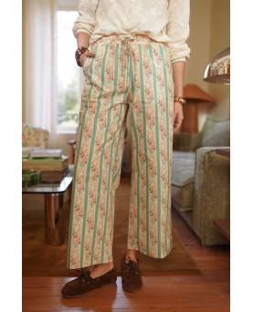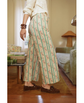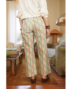 Pantalón en color beige con rayas en color turquesa y detalles de flores. Corte recto con goma en la cintura y lazada para ajustar. Muy cómodos perfectos para el día a día