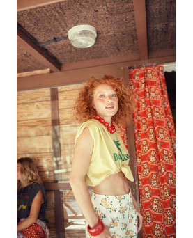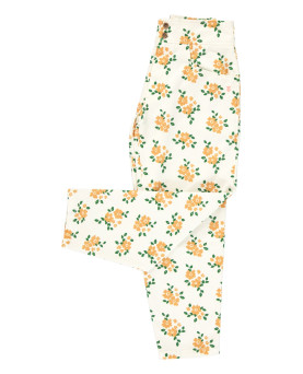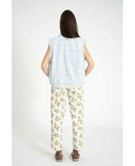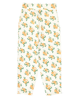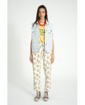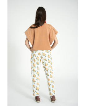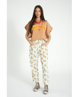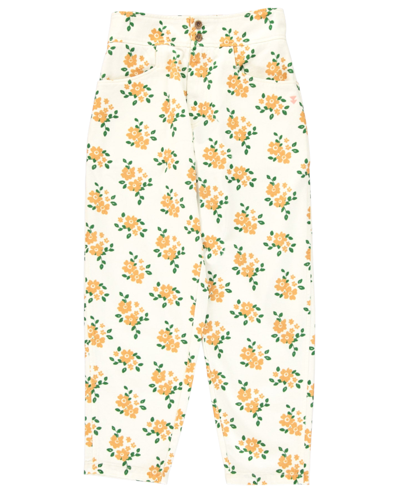 Pantalón confeccionado en sarga de algodón de tiro alto en color blanco roto con estampado de flores en color mostaza. Corte ligeramente globo. Bolsillos delanteros.