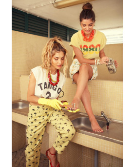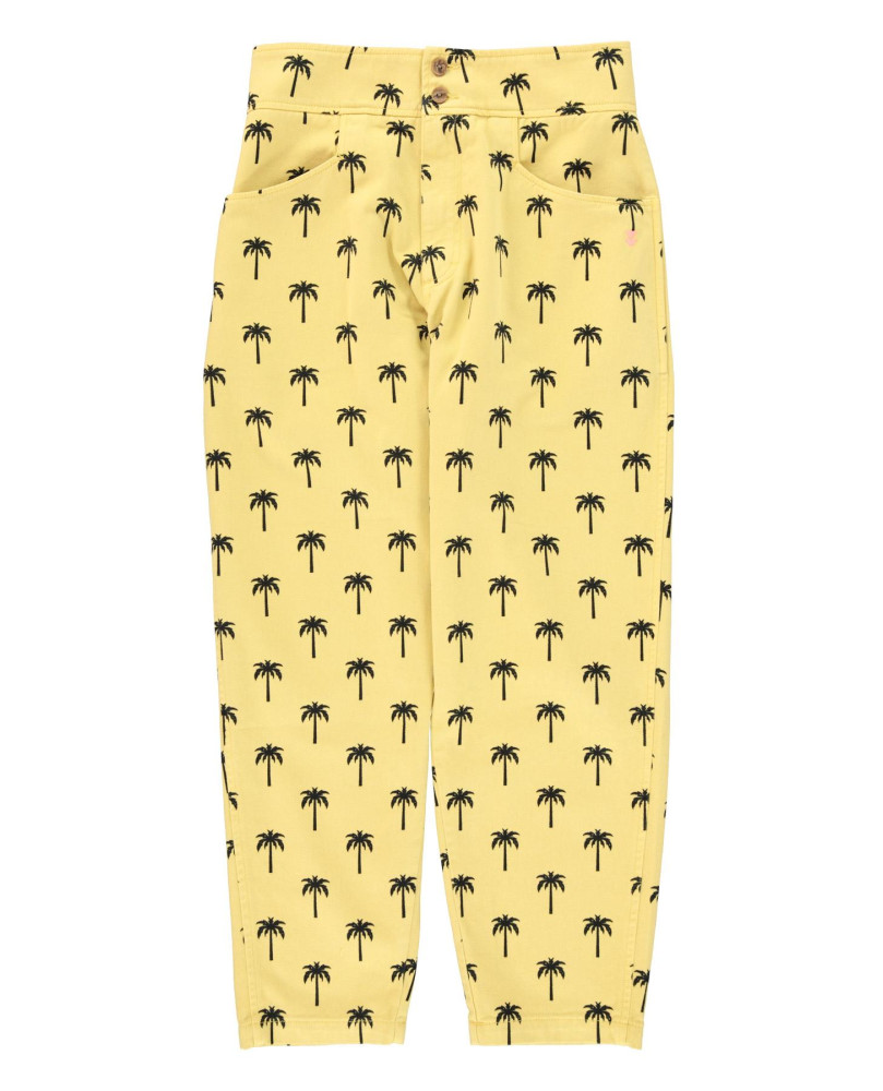 Pantalones en color amarillo con estampado de palmeras. Confeccionados en sarga de algodón. Cintura alta y corte ligeramente globo. Bolsillos delanteros. Trabillas para cinturón.