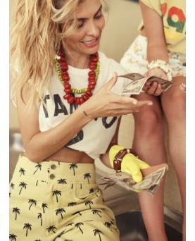 Pantalones en color amarillo con estampado de palmeras. Confeccionados en sarga de algodón. Cintura alta y corte ligeramente globo. Bolsillos delanteros. Trabillas para cinturón.
