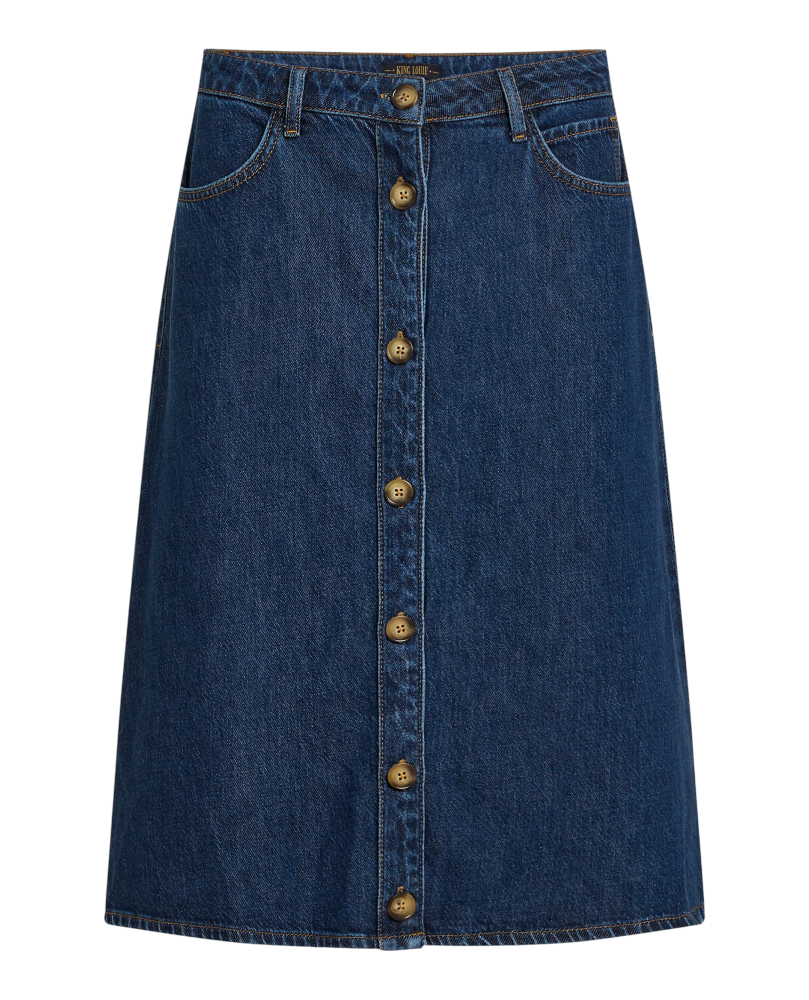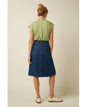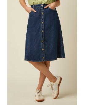 Falda vaquera con corte a capa con forma de A. Cintura alta. Abotonada de la cintura al bajo. Corte confeccionada con tejidos de celulosa reciclada como vaqueros etc...