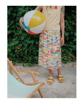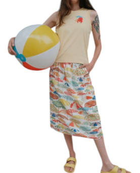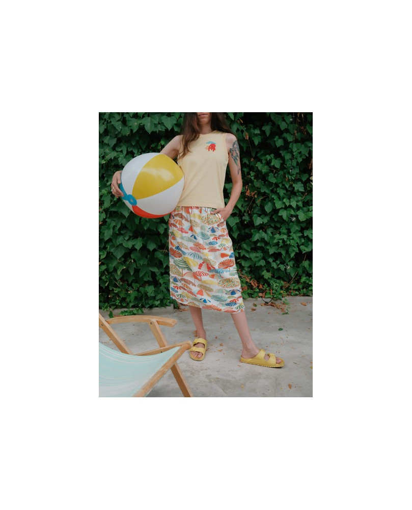 Falda midi de silueta fluida confeccionada en viscos, perfecta para los días de verano. Su corte relajado y su caída natural aportan movimiento y comodidad, adaptándose al cuerpo sin marcar.