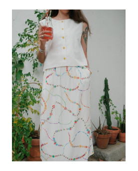 Ideal para llevar con camiseta bordada de naranja o tops más especiales, es una falda cómoda, fresca y muy fácil de estilizar en el día a día. La modelo lleva una talla S.