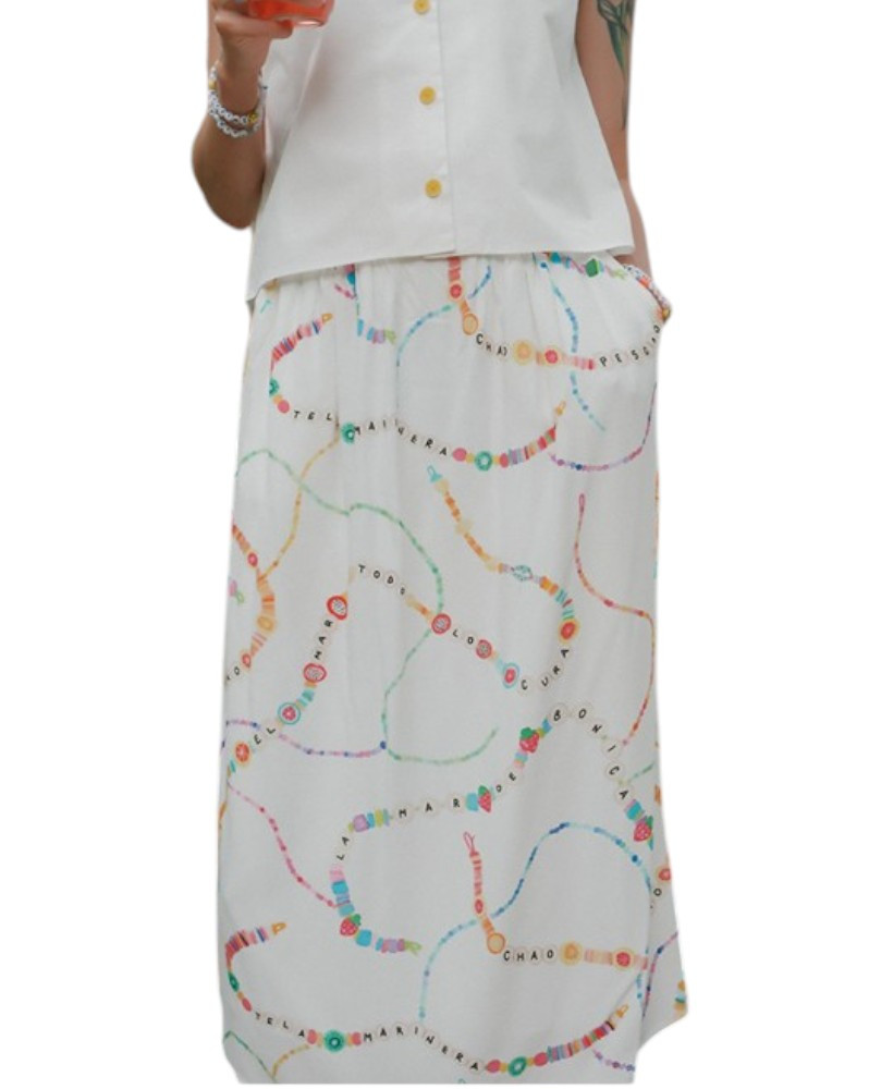 El largo midi, por debajo de la rodilla, la convierte en una prenda versátil tanto para looks casual como para ocasiones más especiales. El estampado de inspiración mediterránea, con motivos de jarrones en tonos vibrantes, aporta personalidad y un toque artístico sin perder la facilidad de combinación.