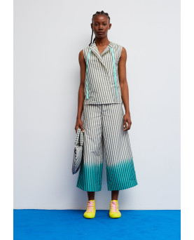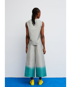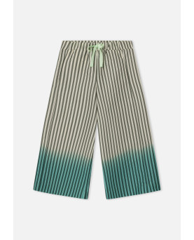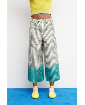 ¡Marca la diferencia y eleva tu outfit sin complicaciones! Un pantalón a rayas en tejido técnico versátil, fresco y con un toque artístico pensado para aportar modernidad a tus looks de verano. Su diseño con rayas verticales en blanco y caqui tienen un degradado turquesa en el bajo que aporta un efecto visual original y único. El cordón a tono agua remata la cintura elástica con un detalle ligero y equilibrado.