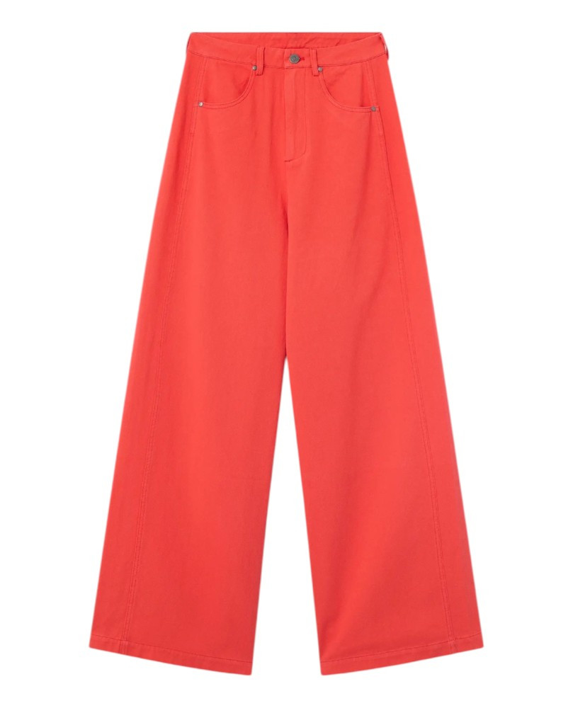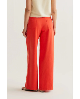 Pantalón de tejido 100% algodón de color rojo. Cintura fija de tiro medio. Cierre frontal con cremallera y botón. Pernera amplia. Bolsillos laterales y posteriores. La modelo mide 177 cm y lleva la talla S.