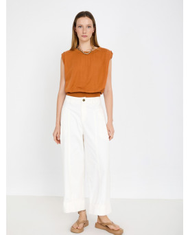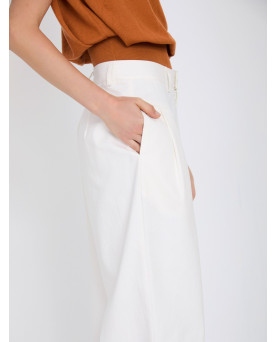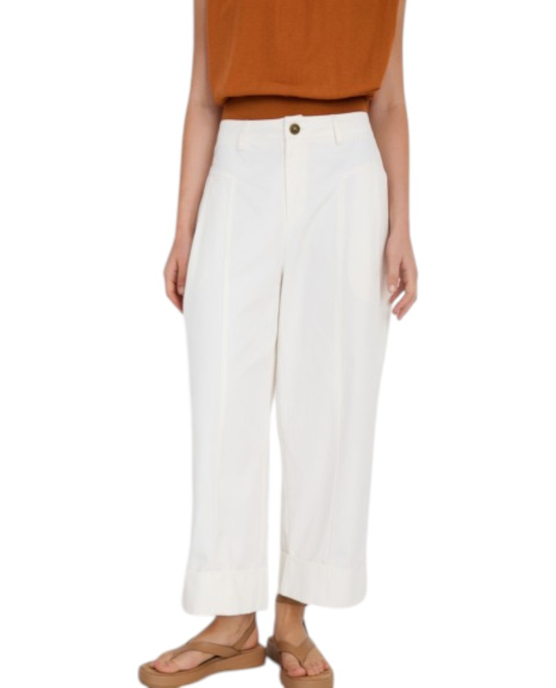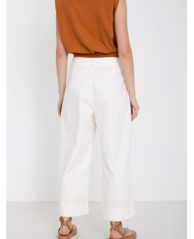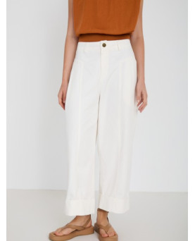 Pantalón largo de denim 100% algodón con dobladillo en el bajo. Tiro medio. Diseño con costura central y detalle de pinzas delanteras. Bolsillos laterales. Cierre frontal con cremallera y botón. Pernera ancha. Fitting recto.