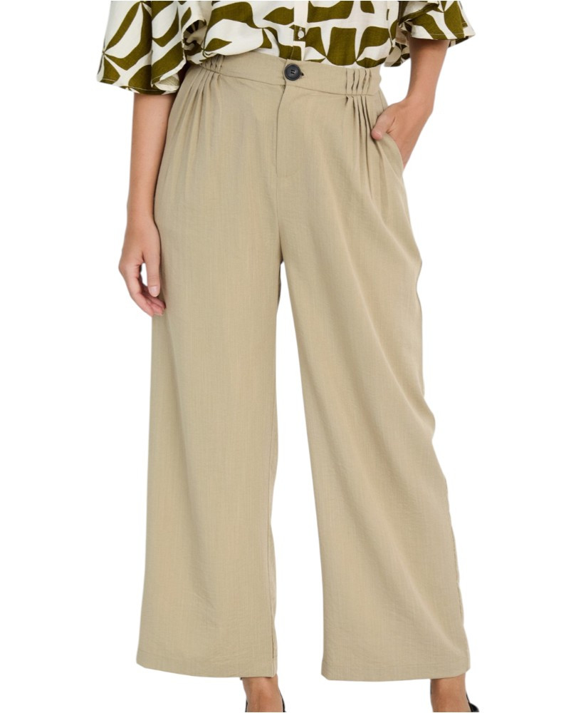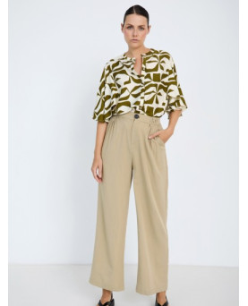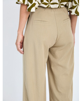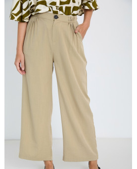 Pantalón largo con tejido fluido en mezcla de viscosa. Tiro medio con jaretas en la cinturilla. Detalle de pinzas en delantero. Cierre frontal con botón y cremallera. Bolsillos laterales. Pernera ancha.