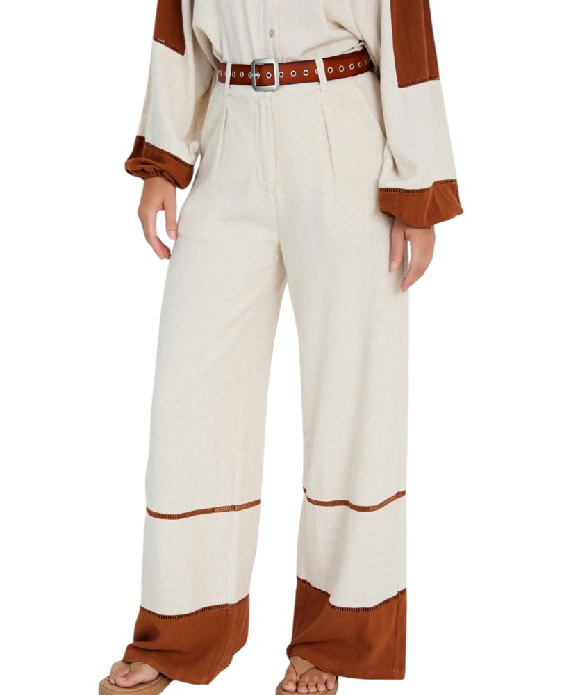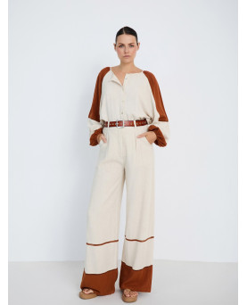 Pantalón largo con tejido de lino y viscosa con el detalle del bajo a contraste con pasamanería de entredós decorativa. Tiro medio con cinturilla con trabillas. Cierre frontal con botón y cremallera. Pernera ancha. Dispone de blusa a conjunto, se vende por separado.