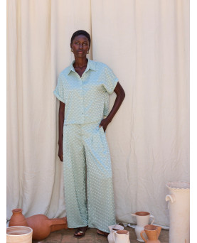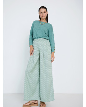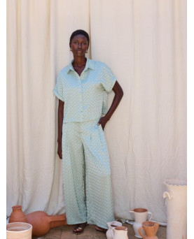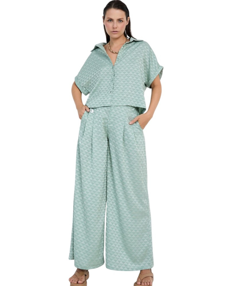 Pantalón largo con tejido Jacquard de poliéster reciclado 100% y motivo geométrico. Tiro medio con cinturilla ancha y detalle de botones decorativos en delantero. Cierre frontal con botón y cremallera. Pernera ancha. Dispone de una camisa a conjunto.