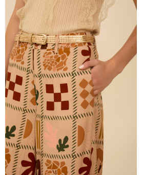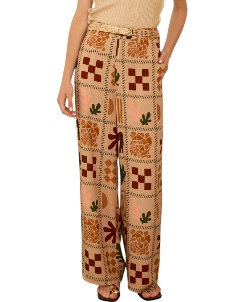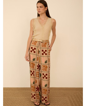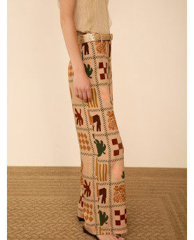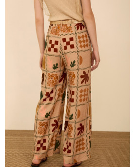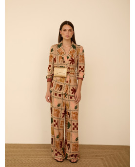 Pantalón largo fluido en viscosa con estampado de motivos savannah. Tiro alto. Cierre frontal con botón a contraste y cremallera. Bolsillos laterales. Bajo con vista interior a contraste. Dispone de blazer a conjunto, se vende por separado.
