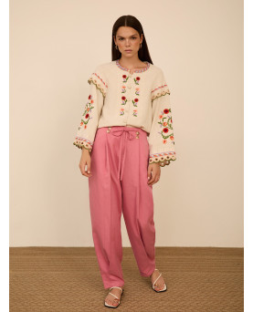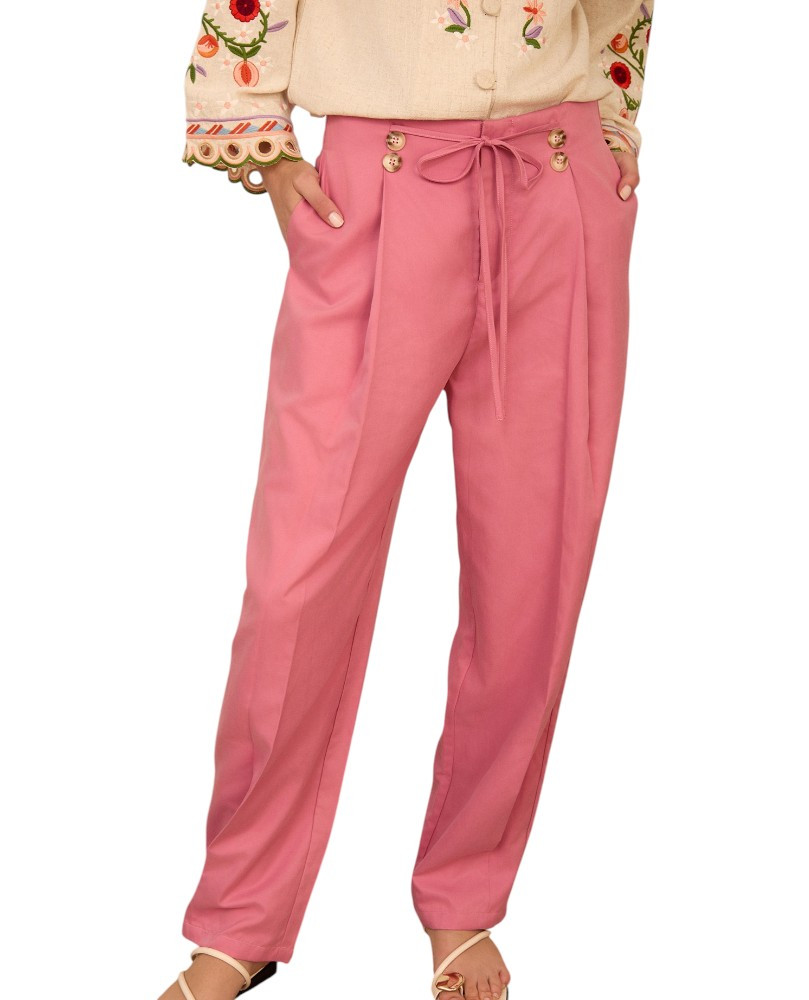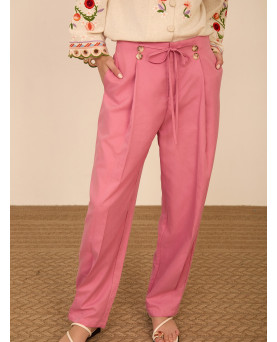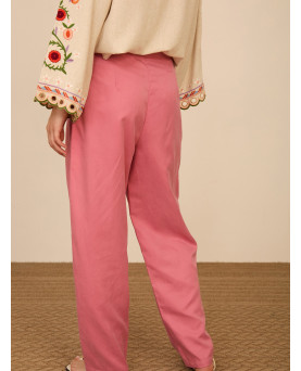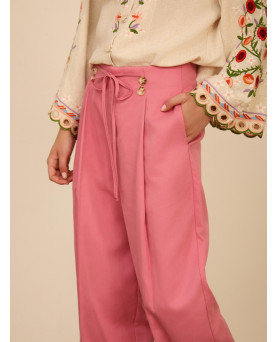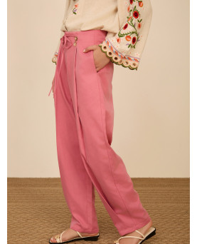 Pantalón tobillero con pinzas. Tejido efecto piel de melocotón. Cierre con cremallera y cintas para ajustarlo. Bolsillos laterales. Tiro alto.