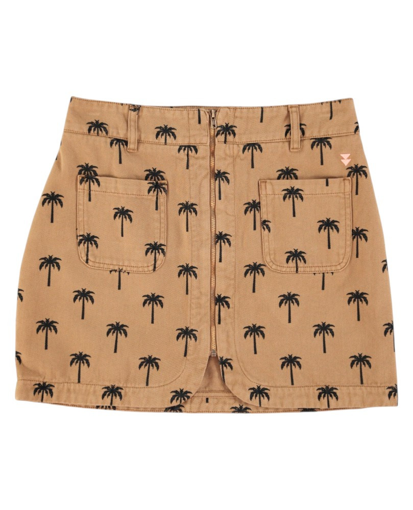 Falda en color camel con estampado de palmeras en color negro. Bolsillos delanteros de plastón. Cierre con cremallera frontal. Largo mini