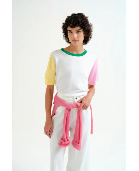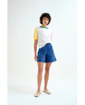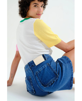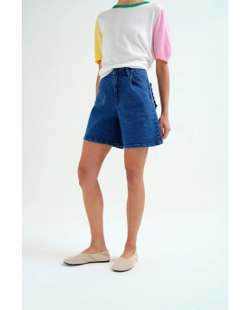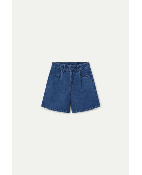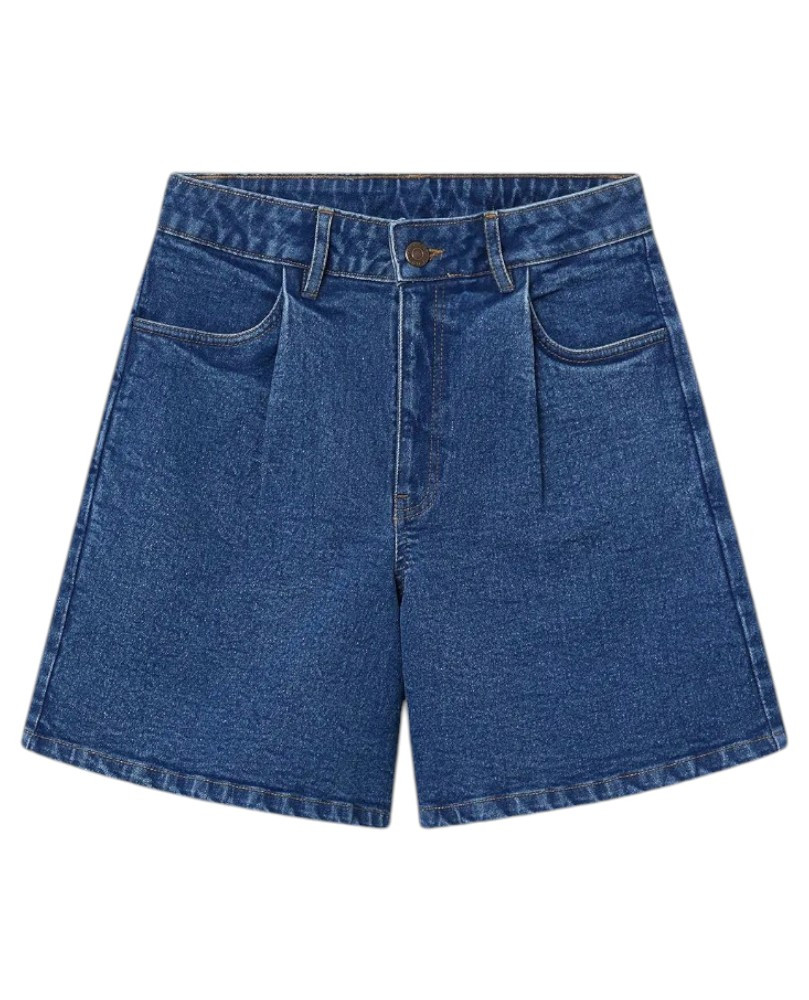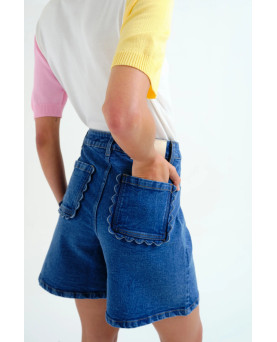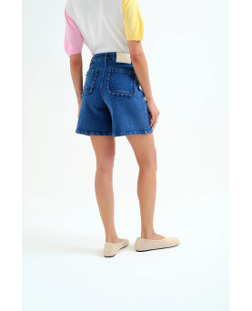 Shorts de tejido denim de color azul. Cintura fija de tiro alto. Cierre con cremallera y botón. Bolsillos laterales y posteriores con detalle de ondas. Pernera recta. La modelo mide 175 cm y lleva la talla S.