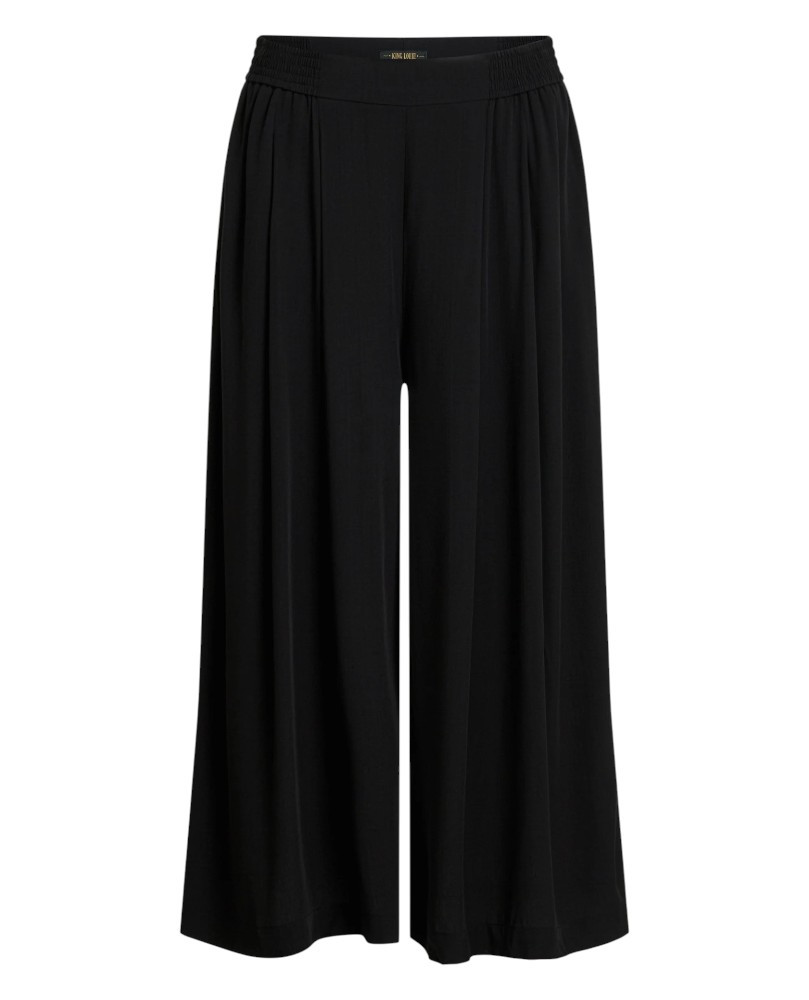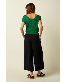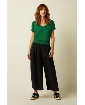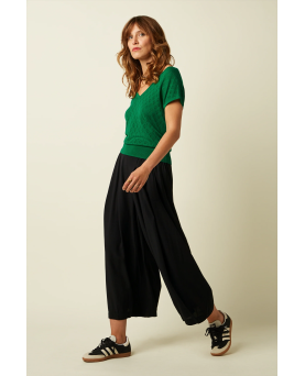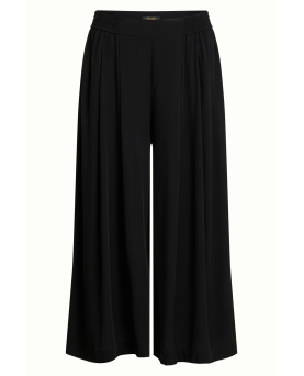 Pantalón culotte en color negro. Pata ancha desde arriba con largo al tobillo. Tejido de viscosa con mucho movimiento perfecto para el calor. Bolsillos laterales. Cintura fija. Tela no elástica