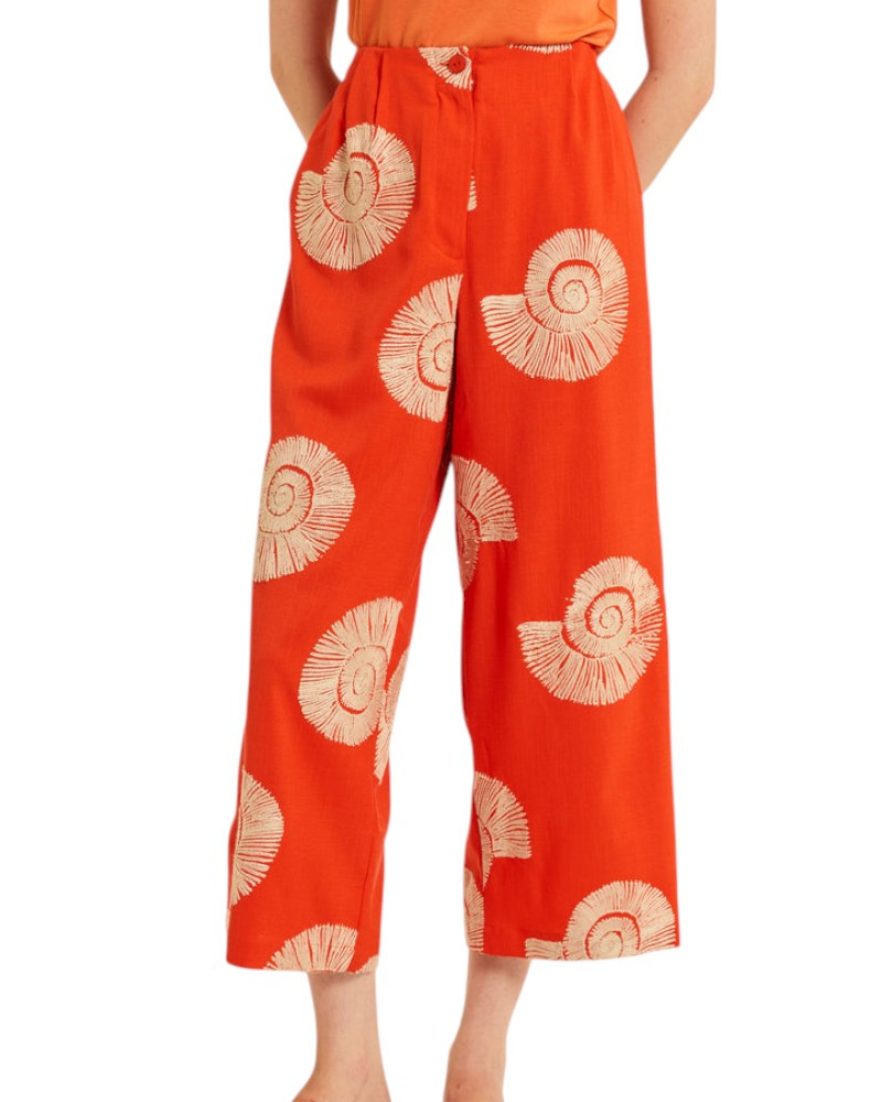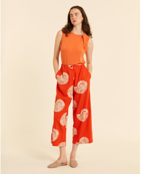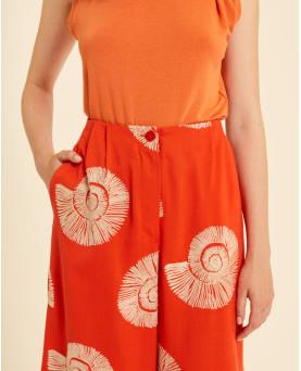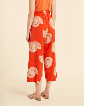 Pantalón culotte en color coral con bordado de caracolas. Cintura fija en la parte delantera y con goma en la parte trasera. Pata ancha desde arriba.